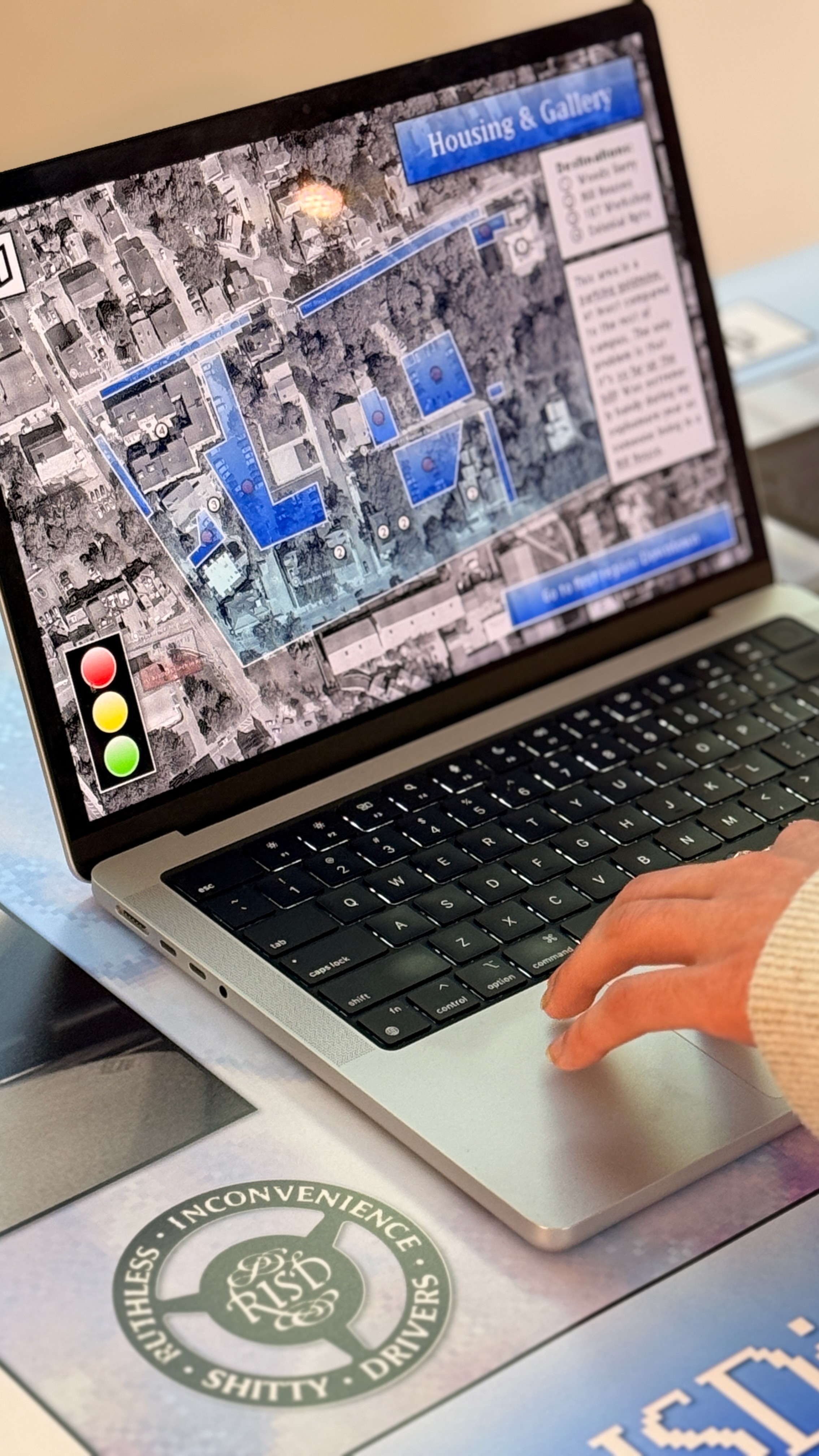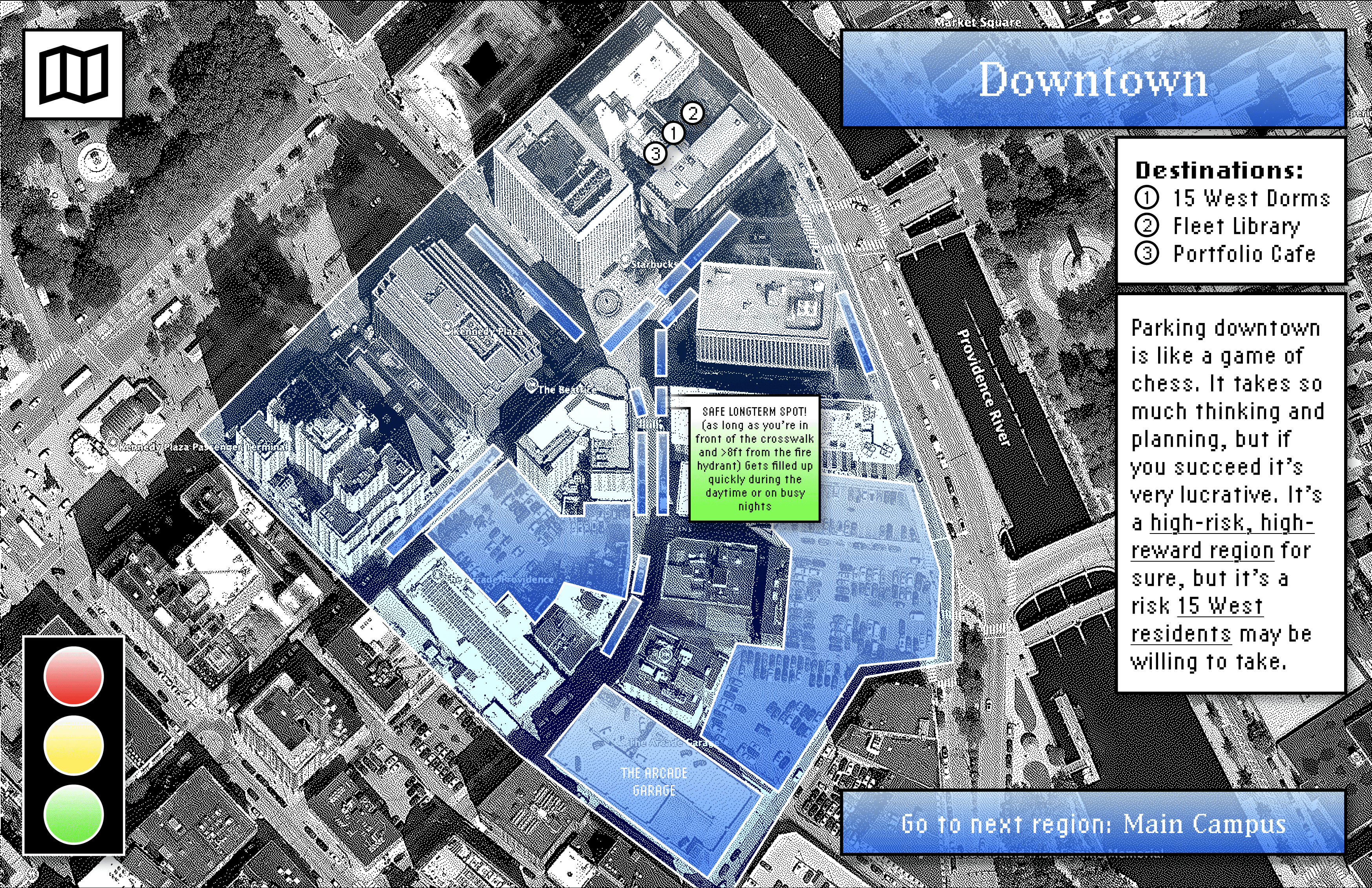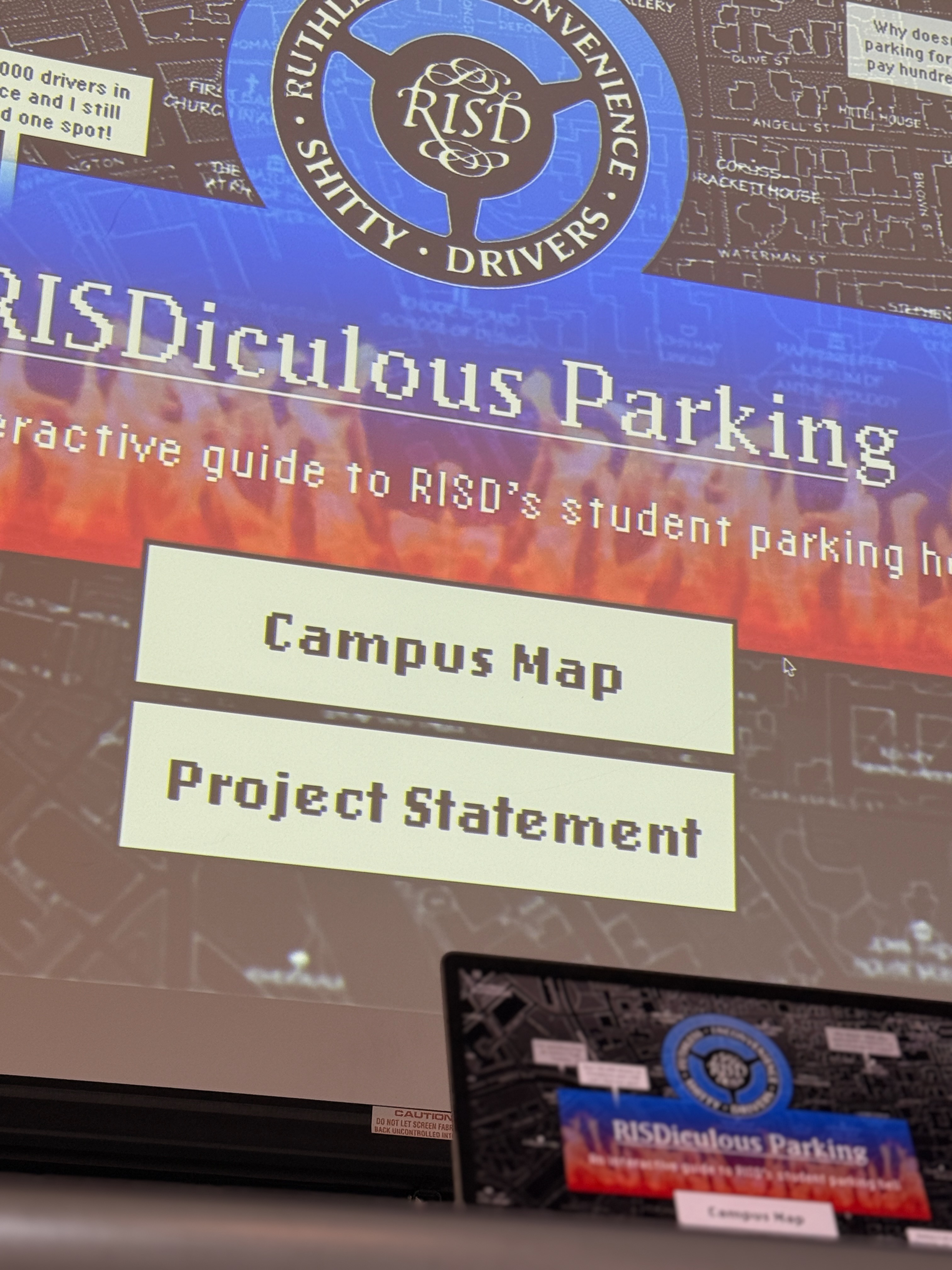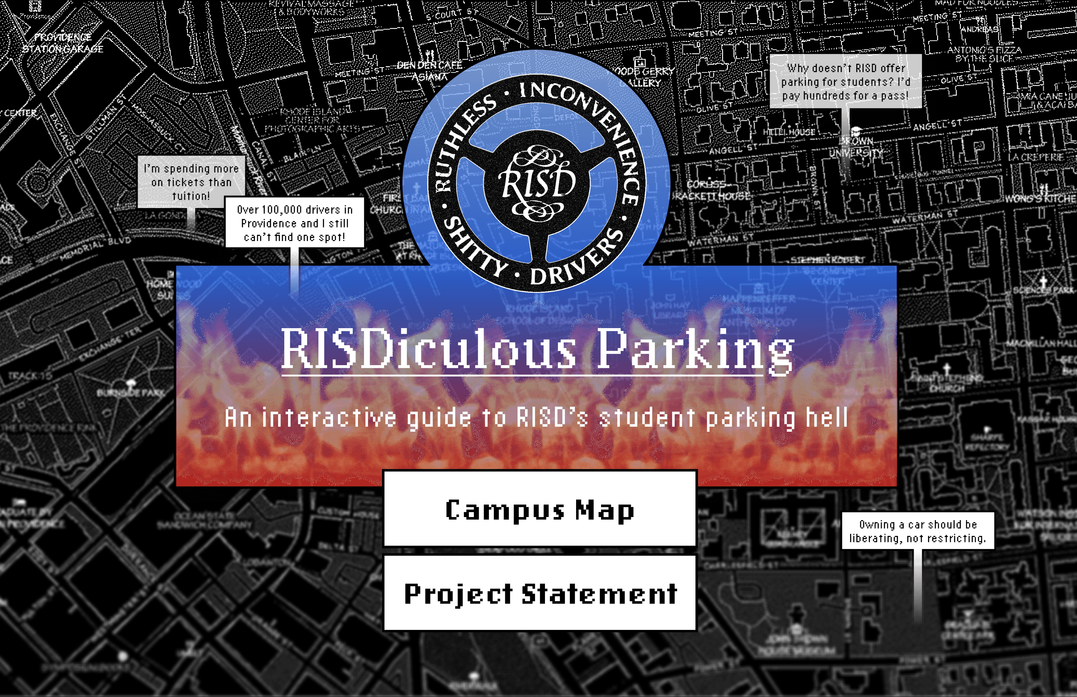 The final outcome is an interactive product which accomplishes the goal of mapping RISD campus' web of parking spots. The interface, design choices, and humor all work together to create an experience that provides both information and critique.